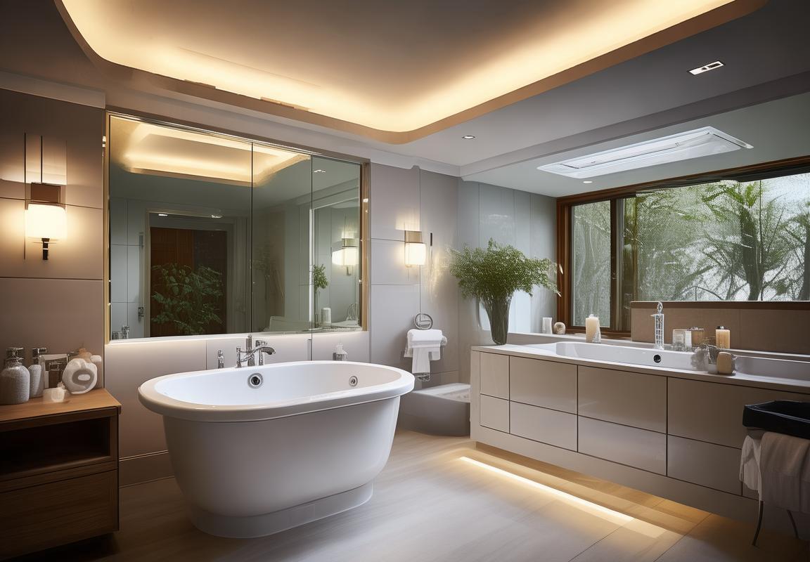 个性化照明氛围为了营造舒适的卫生间氛围,可以在卫生间安装可调节亮度和颜色的LED灯带。根据使用需求和心情变化,调节灯光的颜色和亮度,创造出温馨、放松的氛围。